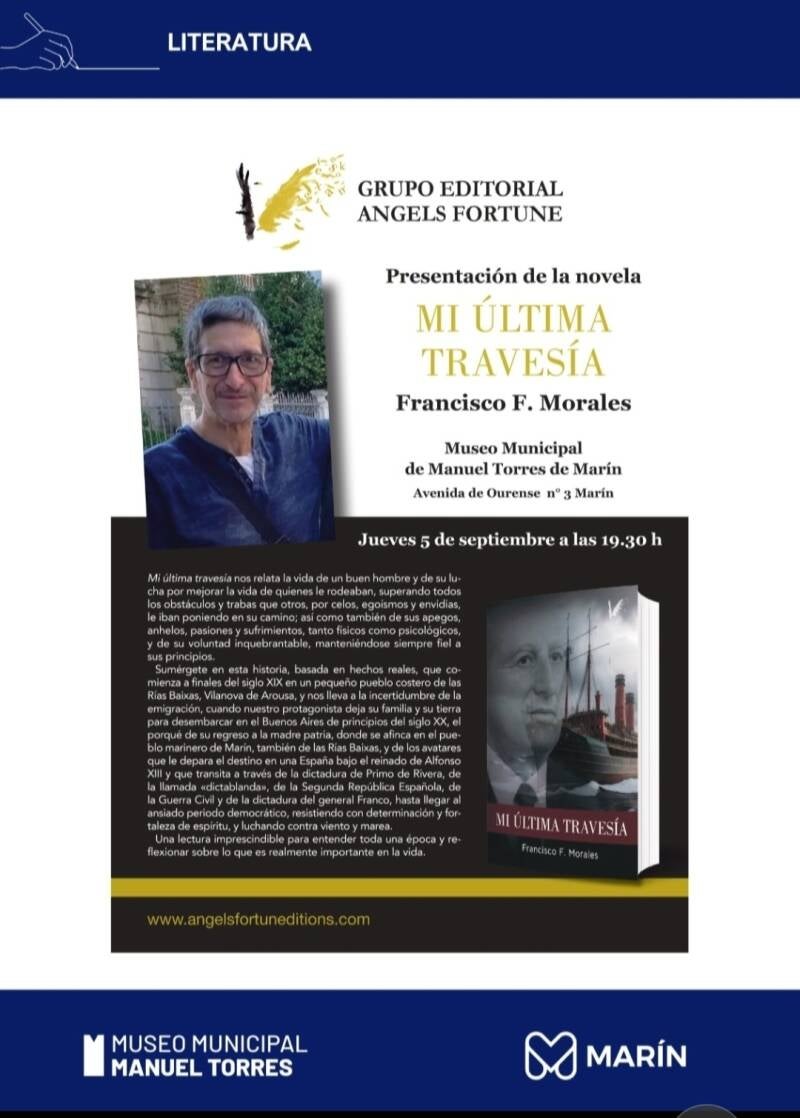 El jueves 5 de septiembre, a las 19:30h, en el Museo Municipal Manuel Torres de Marín, tuvo lugar, de la mano de Angels Fortune Editions, el acto de presentación de mi novela "La última travesía". Fue un acto especialmente emotivo para mí, un sueño que tras más de 45 años persiguiéndolo se convirtió en una maravillosa realidad; por fin pude llevar a cabo mi pequeño homenaje a mi querido abuelo Jesús, escribiendo una novela que recoge sus memorias y presentándola en primer lugar en el pueblo en el que residió durante 60 años y del que fue una figura relevante de su historia.